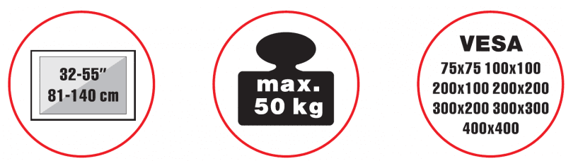 La gestione dei cavi integrata (fermacavi sulla colonna) accoglie elegantemente i cavi dei dispositivi corrispondenti e garantisce un aspetto ordinato. Il carico massimo del supporto TV reflecta 80 Super Slim è di 40 kg. Il sistema di montaggio universale dello schermo include lo standard VESA (200×200, 300×200, 300×300, 400×200, 400×300, 400×400, 600×400).